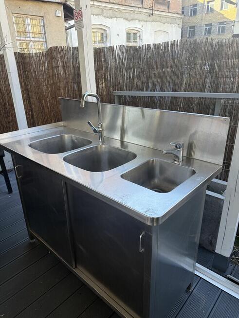 profesjonalny zlew gastronomiczny 3-komorowy ze stali nierdzewnej, z szafką i bateriami Stan bardzo dobry